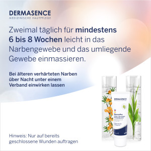 Pflegetipp: Ein möglichst früher Beginn der Anwendung bewirkt den besten Pflegeeffekt. Bei verhärteten, älteren Narben die Emulsion über Nacht unter einem Verband einwirken lassen.