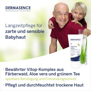 Anwendung: Bis zu zweimal täglich eine erbsengroße Menge der DERMASENCE Vitop forte Junior auf betroffene Hautareale auftragen. Eine Langzeitanwendung ist unbedenklich möglich.