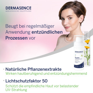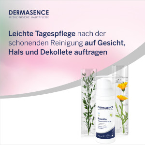 Die DERMASENCE RosaMin Tagespflege mit LSF 50 ist eine leichte Emulsion, die speziell für empfindliche, zu Rötungen neigende Haut entwickelt wurde. Ein pflanzlicher 5-fach-Wirkkomplex stärkt die Gefäße und wirkt Rötungen entgegen, während Panthenol aktiv die Haut beruhigt und Missempfindungen wie Brennen, Hautprickeln und Hitzegefühl mindert. Die Tagespflege schützt die Haut mit Lichtschutzfaktor 50 vor belastender UV-Strahlung und kann bei regelmäßiger Anwendung entzündlichen Prozessen vorbeugen. Die parfümfreie Emulsion beruhigt die Haut und macht sie widerstandsfähiger. Sie ist dermatologisch getestet und frei von Seifen und Parfüm.
