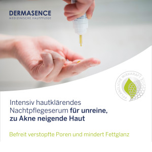 Pflegetipp: Bei stark ausgeprägten Unreinheiten in Kombination mit dem DERMASENCE Seborra Pickel-Akutroller zu empfehlen. Um vor UV-bedingten Hautschäden zu schützen, empfehlen wir die DERMASENCE Seborra Leichte Tagespflege mit LSF 30.